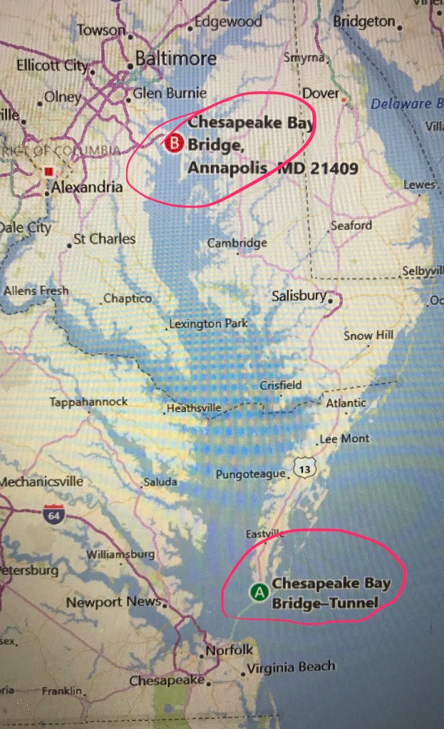 Depending where you’re coming from and where you’re going to, the bridge you take is important. In the map below, B is the Chesapeake Bay Bridge and A is the Chesapeake Bay Bridge-Tunnel.